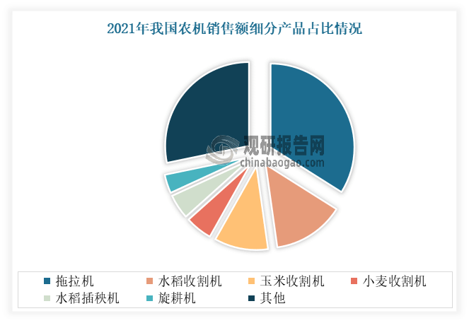 此中一曲以来,拖沓机正在我国农业机械市场中占比处于较高地位。以2021年的数据为例,2021年正在农业机械市场中,拖沓机发卖额占比最大,达到33。96%;其次为水稻收割机及玉米收割机,发卖额占比别离为13。82%和10。37%?。
